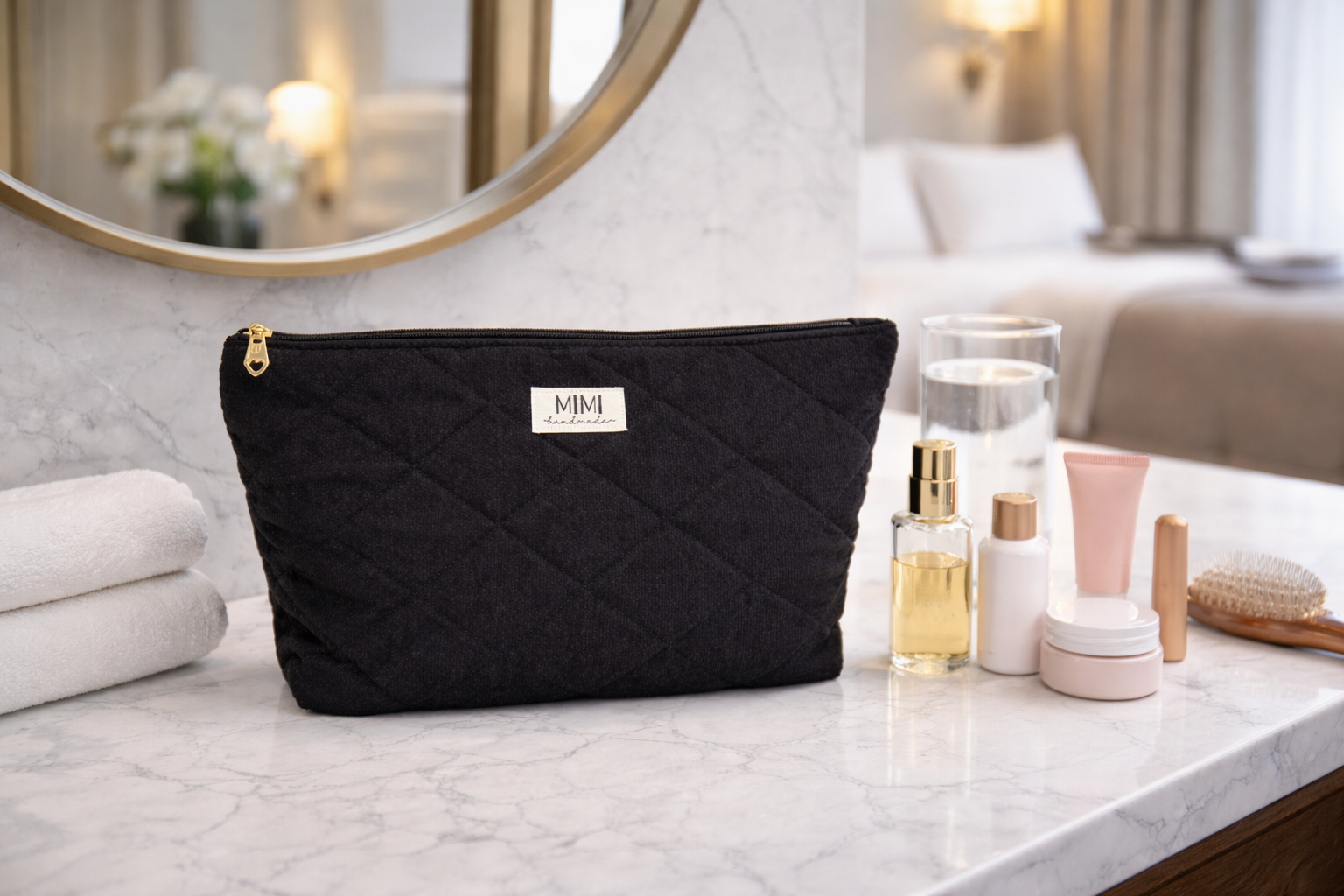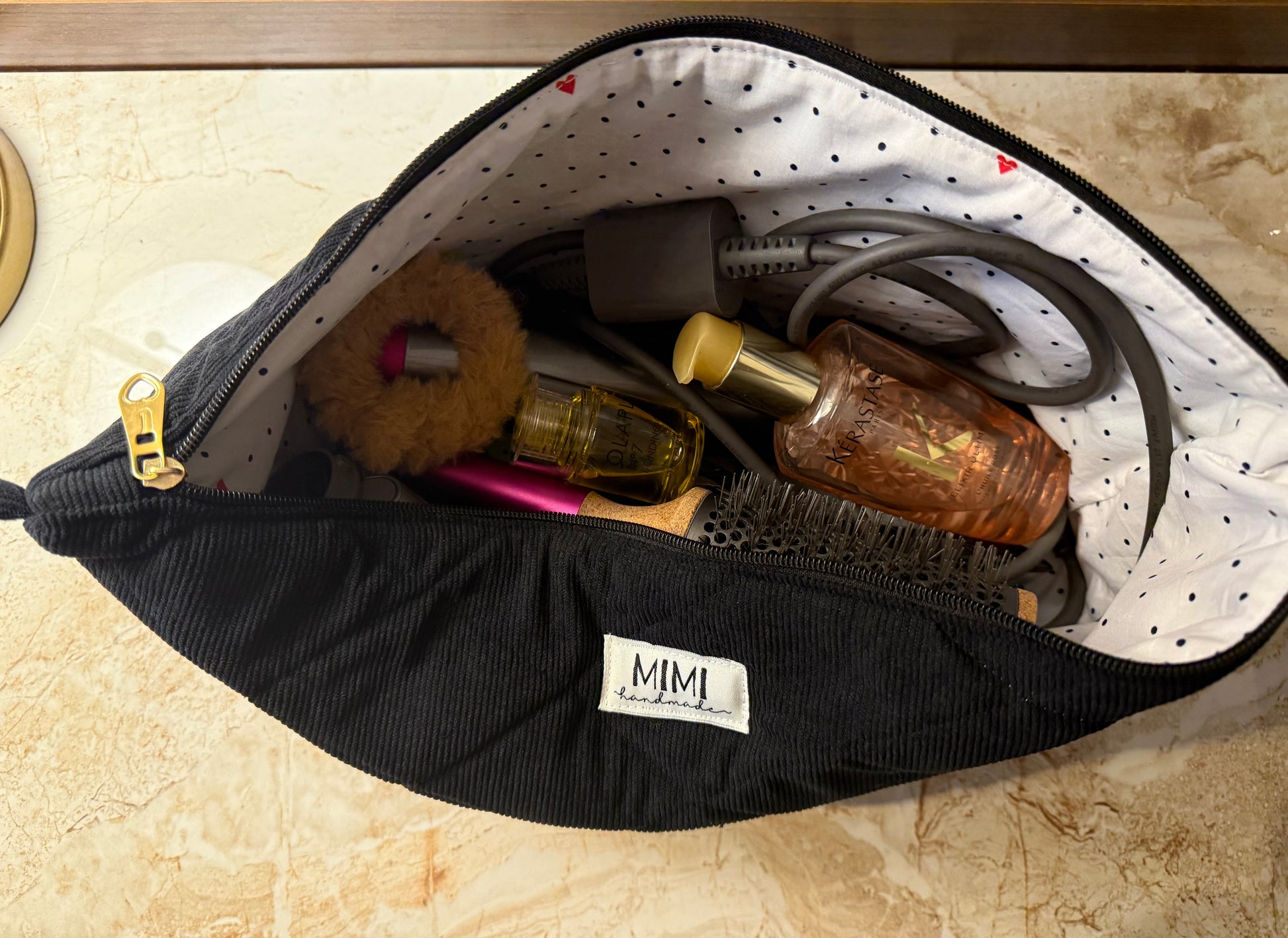 A hair tool organiser for home & travel. A spacious, elegant pouch designed to store your hair dryer, straightener, serums and daily hair essentials—keeping your vanity and travel bag effortlessly organised and dust-free.